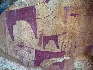 На стенах пещер обнаружены многочисленные петроглифы, изображающие, в основном, коров, а также людей, волков или собак и жирафов. Особенно интересны рисунки коров: у всех них необычные лирообразные рога, многие из них одеты в церемониальную одежду, их шеи украшены неким панцирем.