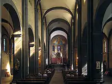 Внутри базилика оформлена также весьма просто, без вычурных декораций и аркад. В начале XIII века вместо деревянного накатного потолка в среднем нефе появился каменный свод. В восточном хоре, где проводятся мессы и находятся места для певчих, располагается уникальный алтарь с киворием. Киворий представляет собой покоящийся на колоннах балдахин; он был приобретен аббатом Дитрихом II фон Леменом в 1256 году. В то время он покрывал недавно созданное надгробие основателя монастыря Генриха II фон Лаах, ранее находившееся в клуатре, поскольку неф не был закончен. Теперь же его прах был захоронен неподалеку от четвёртой с запада пары колонн нефа. Усыпальница представляла собой нишу с саркофагом, над которой находилось надгробие с великолепной фигурой Генриха, выполненной из дерева. С XVII века балдахин осеняет главный алтарь собора. При аббатах Альберте и Грегоре был создан леттнер (алтарная перегородка); в XVII веке он был разрушен, но его скульптурные детали, включая фигуру Самсона, хранятся и сейчас в музее монастыря. При аббате Теодерихе были надстроены в готическом стиле башни — их навершия стали более крутыми, и на них появились карнизы; также при нём в восточном хоре появились окна в раннеготическом стиле. Пятнадцатый аббат, Виганд фон Паннау (1335—1360), закончил надстройку башен. Во время служения двадцать второго аббата, Симона фон дер Лайена, по его настоянию был надстроен парадиз, а часть колонн расписана фресками с изображениями святых Бенедикта (основатель ордена, юго-западная колонна западного хора), Николая (один из покровителей собора, северная сторона той же колонны; на фреске изображен среди прочих аббат Симон) и Христофора (южная сторона северо-западной колонны). До XIX века включительно двойные двери парадиза были заперты. В последующие годы монастырские здания частично перестраивались.