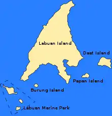 Федеральная Территория Лабуан состоит из острова Пулау-Лабуан (75 км²) и шести меньших островов (Пулау-Бурунг, Пулау-Даат, Пулау-Кураман, Пулау-Папан, Пулау-Русукан-Кечил, Пулау-Русукан-Бесар), общая площадь всех островов — 92 км². Острова находятся 8 км от побережья острова Калимантан.
