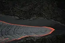 Магма, выходя на поверхность, освобождается от газов и становится лавой[2]. Скорость движения потока лавы может достигать нескольких метров в секунду. Температура лавы лежит в пределах от 1000 °С до 1200 °C.