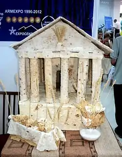 - Lavash, the preparation, meaning and appearance of traditional bread as an expression of culture in Armenia, офиц. сайт ЮНЕСКО: Оригинальный текст (англ.)[показатьскрыть]Lavash is a traditional thin bread that forms an integral part of Armenian cuisine. Its preparation is typically undertaken by a small group of women, and requires great effort, coordination, experience and special skills. A simple dough made of wheat flour and water is kneaded and formed into balls, which are then rolled into thin layers and stretched over a special oval cushion that is then slapped against the wall of a traditional conical clay oven. After thirty seconds to a minute, the baked bread is pulled from the oven wall. Lavash is commonly served rolled around local cheeses, greens or meats, and can be preserved for up to six months. It plays a ritual role in weddings, where it is placed on the shoulders of newlyweds to bring fertility and prosperity. The group work in baking lavash strengthens family, community and social ties. Young girls usually act as aides in the process, gradually becoming more involved as they gain experience. Men are also involved through the practices of making cushions and building ovens, and pass on their skills to students and apprentices as a necessary step in preserving the vitality and viability of lavash making.