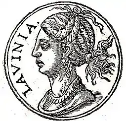 Лавиния (лат. Lavinia) — персонаж римской мифологии [2]. По наиболее распространённой версии сказания, дочь Енея Латина [3], царя Лациума и Аматы, жена Энея [4]. Из-за страха перед Асканием после смерти Энея бежала в лес к пастуху Тирру и родила там Сильвия[уточнить] [5]. Будучи невестой местного князя, должна была по желанию отца выйти замуж за троянского выходца Энея, которому она родила Сильвия[уточнить]. Лавиния воспета римскими поэтами Вергилием и Овидием.