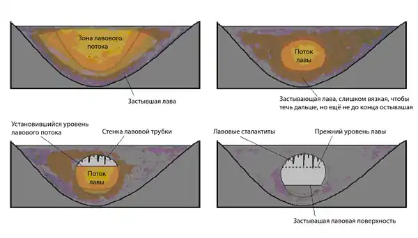 Существует два способа образования лавовых трубок: путём затвердевания корки над поверхностью лавовых каналов и благодаря потокам лав типа pahoehoe (пахоэхоэ), движущихся под поверхностью[3].