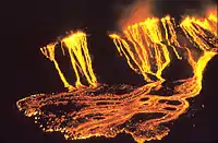 - из одного или нескольких отверстий в кратере вулкана, извергающем достаточно лавы, чтобы частично заполнить кратер