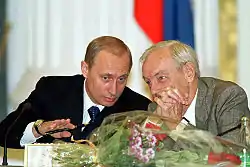 | Алексей Баталов, Михаил Ульянов, Кирилл Лавров и Владимир Путин 1 марта 2000 года. |