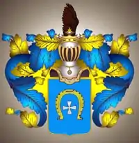 Выдержка из Общего гербовника В щите, имеющем голубое поле, изображена золотая подкова, шипами вниз обращённая и в оной серебряный крест. Щит увенчан дворянским шлемом и короною, на которой находится орлиное крыло. Намёт на щите голубой, подложен золотом. |