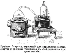 Явления тепла, тесно связанные с процессом горения, составляли также предмет изучения Лавуазье. Вместе с Лапласом, будущим творцом «Небесной механики», Лавуазье даёт начало калориметрии; они устраивают ледяной калориметр[15]. С помощью его они измеряют теплоёмкости многих тел и тепло́ты, освобождающиеся при различных химических превращениях, например при сгорании угля, фосфора, водорода, при взрыве смеси селитры, серы и угля.