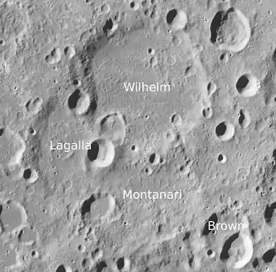 Ближайшими соседями кратера являются кратер Вильгельм, частично перекрывающий северо-восточную часть кратера Лагалла и кратер Монтанари примыкающий к кратеру Лагалла на юго-востоке. На северо-востоке от кратера находится Озеро Благоговения[2].