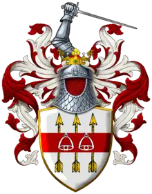 В щите, имеющем серебряное поле, изображены перпендикулярно три стрелы, летящие вверх и на них горизонтально красная полоса с двумя серебряными стременами.