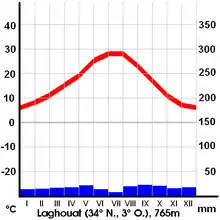 Лагуат имеет холодный пустынный климат (Классификация климатов Кёппена BWk). Среднегодовая температура в Лагуате составляет 17.4 °C (63,3 °F). Около 176 мм (6,93 ″) осадков выпадает ежегодно. Осадков зимой больше, чем летом.