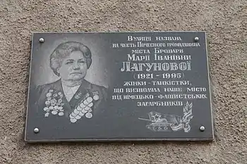 - Мемориальная доска в городе Бровары установлена на одном из домов по улице, названной в её честь (ул. М. Лагуновой (укр. Вулиця Марії Лагунової), 4)