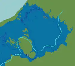 Береговая линия Ладожского озера в период максимума Ладожской трансгрессии перед появлением Невы (между 4500 и 2500 лет назад). Показаны долины рек Мга и Тосна, а также водораздел между ними.