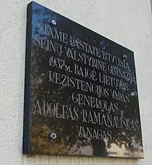 Мемориальная доска лидера антисоветского сопротивления Адольфаса Раманаускаса на гимназии Лаздияй