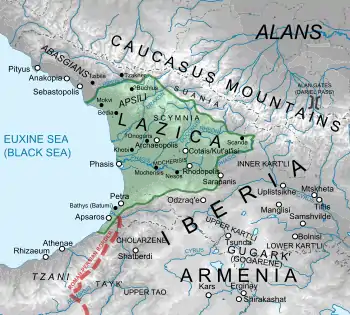По заключенному в 532 году «Вечному миру» Персия признавала Лазику входящей в сферу византийского влияния. Агрессивные попытки Византии установить здесь свою администрацию вызвали в 541 году восстание лазов. В этом же году, в ответ на призыв лазского царя Губаза II, персидский шаханшах Хосров I вошёл в Лазику и захватил основную византийскую крепость Петру, установив свой контроль над регионом. Однако попытки шаха установить прямой контроль над страной и его усилия по распространению зороастризма вскоре вызвали недовольство христианских священников, приведшее к мятежу в 548 году. Губаз запросил помощи Юстиниана и вступил в союз с аланами и сабирами.