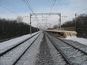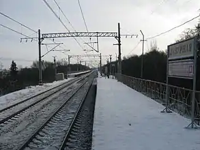 На станции имеются две высокие посадочные боковые платформы, разнесенные друг относительно друга. Переход между платформами осуществляется по бетонным настилам, оборудованным сигнализацией. Турникетами не оборудована.