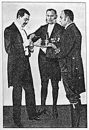 Камердинер (в центре) и лакей (справа) подают вино. Иллюстрация из H. Reuß zu Köstritz: Der korrekte Diener, Paul Parey Verlag, Берлин 1900; с. 21