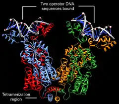 Лактозный репрессор — необычный тетрамер. Его мономеры формируют стабильные димеры. Это взаимодействие обеспечивается пятью кластерами аминокислот. Димеры, в свою очередь, могут объединяться с образованием тетрамеров за счёт взаимодействия С-концевых альфа-спиралей (остатки 340—357). Каждая спираль содержит два участка, состоящих из семи остатков лейцина, которые и обеспечивают взаимодействие четырёх альфа-спиралей. Тетрамеры лактозного репрессора корректнее рассматривать как димеры димеров, поскольку они не имеют симметрии, характерной для других олигомерных белков. Связывание с ДНК осуществляют именно димеры, то есть каждый тетрамер лактозного репрессора может быть связанным с двумя операторами[1].
