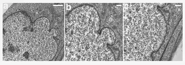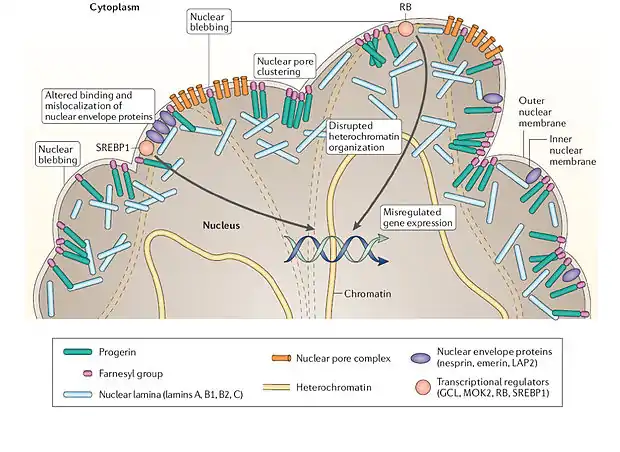 - Paradisi M., McClintock D., Boguslavsky R.L., Pedicelli C., Worman H.J., Djabali K. Dermal fibroblasts in Hutchinson-Gilford progeria syndrome with the lamin A G608G mutation have dysmorphic nuclei and are hypersensitive to heat stress (англ.) // BMC Cell Biol. : journal. — 2005. — Vol. 6. — P. 27. — doi:10.1186/1471-2121-6-27. — PMID 15982412.