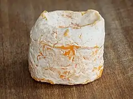 Головка сыра, покрытая тонкой сморщенной коркой, имеет цилиндрическую форму. Большие головки имеют диаметр 16-20 см, высоту 5-7 см и вес около 800 г, малые — диаметр 7,5-9 см, высоту 4-6 см и вес около 150 г.[2] В центре головки находится впадина глубиной 0,5 см, которую называют «фонтан» (фр. fontaine). Солоноватая и упругая мякоть имеет жирность 50 %. Сыр имеет резкий запах и пикантный вкус копчёного бекона.