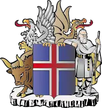 «щит с серебряным крестом на небесно-голубом поле, с огненно-красным крестом внутри серебряного креста. Изображены на гербе должны быть четыре духа-хранителя земли, которые упоминаются в Хеймскрингле: бык — на правой стороне герба, горный великан — на левой, большая птица — на правой, выше быка, и дракон — на левой, выше горного великана.»[4]