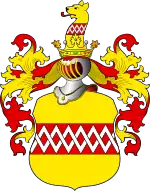В золотом щите червленый пояс, на нем серебряная ромбовидная решетка.