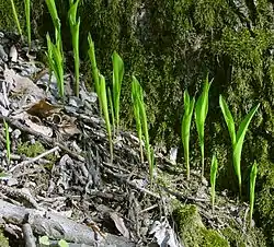 На следующий год верхушечная почка продолжает собой корневище и опять приносит два (как исключение — три) больших листа, но цветоносный стебель редко появляется ежегодно.