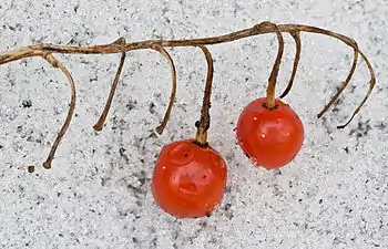 Плод — оранжево-красная шаровидная ягода 6—8 мм в поперечнике, содержащая одно или два почти шаровидных семени. Ягоды долго сохраняются на растении. Плодоношение в июне — начале июля.