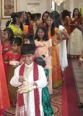 В 1981 году около восьмидесяти процентов ланкийских тамилов исповедовали индуизм, в основном шиваизм.[92] Остальные были в основном католики, которые появились после португальского завоевания царства Джафна и прибрежных областей Шри-Ланки. Существует также небольшое число протестантов, в связи с миссионерскими усилиями в XVIII веке ряда организаций, таких как американская цейлонская миссия.[93] Большинство тамилов, населяющих Западную провинцию являются католиками, в то время как в Северную и восточную провинцию населяют в основном индусы.[94] Пятидесятники и другие церкви, такие как Свидетели Иеговы, активно набирают членов среди внутренне перемещенных лиц и беженцев.[95]