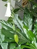 Листья цельные, овальные, с заострёнными кончиками, кожистые, блестящие, с немногочисленными продольными жилками, длиной от 7 до 15 см.
