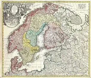 ![]() Карта Скандинавии Юхана Хоманна времён Лапландской экспедиции Линнея (напечатана примерно в 1730 году). Территория Лапландии окрашена в бледно-жёлтый цвет | ||||||||||||||||||||||||