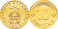 - монеты номиналом в 1, 2, 5, 10, 20 и 50 сантимов, в 1, 2 и 5 латов;