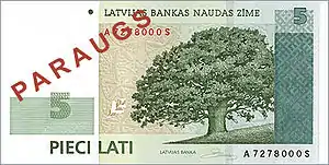 | Банкноты | 5, 10, 20, 50, 100 и 500 латов | ||