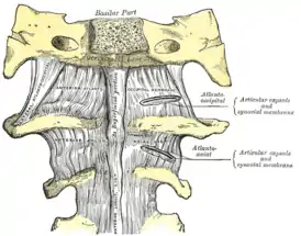 В то же время латеральные атлантоосевые суставы составляют комбинированное сочленение с срединным атлантоосевым суставом и поперечной связкой атланта, которая натянута между внутренними поверхностями латеральных масс I шейного позвонка. В этом комплексе суставов происходит единственное движение — вращение головы[2].