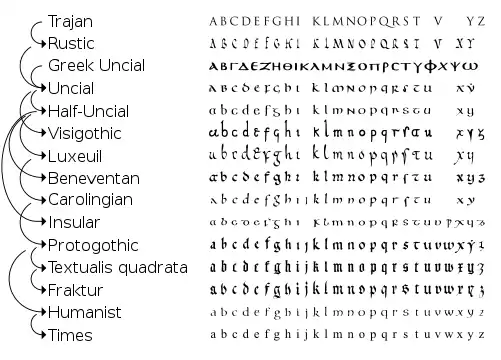 С начала эпохи книгопечатания (Библия Гутенберга, 1450-х годов) до 1540-х годов в латинском языке использовался готический шрифт. Одними из последних изданий готическим шрифтом на латинском языке являются: Psalterium 1542 года (при этом, основной текст набран антиквой, а комментарий — готическим шрифтом), Breviarium 1540 года, Rosarium 1525 года, Euangelium 1508 года. Издания после 1540-х годов на латинском языке встречаются только антиквой, но антиква появилась не в то же время: встречаются издания антиквой и до 1540-х годов. В готическом шрифте буква j была вариантом буквы i (если подряд записывалось две и более букв i, последняя из них выглядела как j). Буква v была начальной формой буквы u. Строчная буква r имела второй вариант начертания (очень похожий на цифру 2), который употреблялся после ряда букв, правая сторона которых была округлой. В готическом шрифте использовались также сокращения и лигатуры.