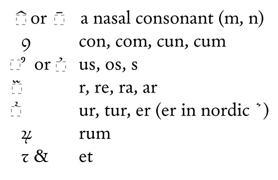 Пример знаков, обозначающих распространённые сочетания букв на конце слов (некоторые встречаются также и в середине слов)