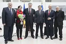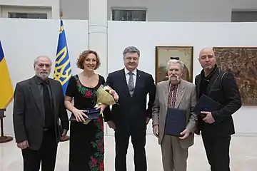Президент Украины Пётр Порошенко и глава комитета с вручения премии Юрий Щербак с лауреатами премии