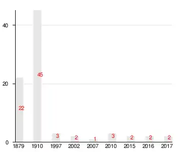 Число жителей по семейным спискам 1879 г.: 7 м. п., 15 ж. п.; по приходским сведениям 1879 г.: 19 м. п., 15 ж. п.[4]