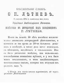 - Летнев П. // Энциклопедический словарь Брокгауза и Ефрона : в 86 т. (82 т. и 4 доп.). — СПб., 1890—1907.