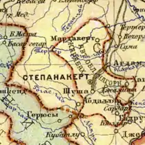 Другая часть авторов (например, Рональд Григор Суни, Роберт Хьюсен, Томас де Ваал и т. д.) придерживается мнения, что образованная в 1923 году Нагорно-Карабахская автономная область не имела общей границы с Арменией[18][6][19][20][21][22]. Как пишет журналист и специалист по Кавказу Томас де Ваал, на карте границы созданной автономной области подходили близко к границам Армении, но не касались их — между ними лежал Лачинский регион Азербайджана[23]. В Атласе СССР, изданном в 1928 году, сказано: «Границы Области со всех сторон представляют различные местности, находящиеся в составе Азербайджанской ССР»[24]. Американский исследователь Арсен Сапаров отмечает, что изначальный список населённых пунктов, подлежавших включению в АОНК, не предопределял наличие границы с Арменией. По его мнению, на некоторых ранних советских картах можно заметить, что границы двух образований касаются, однако масштаб карт слишком мелок, чтобы однозначно судить об этом, и на сегодняшний день нет веских оснований полагать, что у автономной области когда-либо имелась общая граница с Армянской ССР[25].