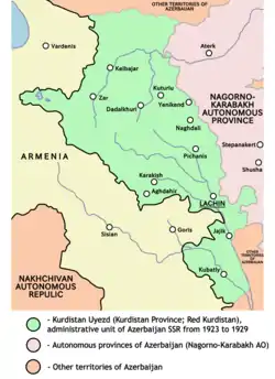 В 1923 году[5][6] в Лачинском коридоре был образован Курдистанский уезд, просуществовавший до 1929 года[7], а из армянонаселённой части Нагорного Карабаха была образована автономная область[8]. Решение об образовании этих двух административных единиц было принято в один день — 7 июля 1923 года[9]. Курдистан становится самостоятельной административной единицей в следующих территориальных границах: на севере Курдистанский уезд был отделён от Гянджинского водоразделом Муровдагского хребта, далее граница с Нор-Баязетским уездом Армянской ССР проходила по Кангуро-Алангёзскому хребту, на юго-западе Курдистан граничил с Шаруро-Даралегезским и Зангезурским уездами Армении. На юго-востоке его границы с бывшим Джебраильским уездом соприкасались по реке Акера, начиная от селения Эфендиляр до впадения в Акеру реки Милхелев, её левого притока. Граница уезда с Нагорным Карабахом начиналась от впадения Милхелев в Акеру и продолжалась вплоть до Муровдагского хребта[10].