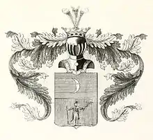 На щите дворянский коронованный шлем. Нашлемник: три страусовых пера. Намёт на щите красный, подложенный золотом (Гербовник, IV, 140).