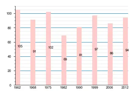 | 1962 | 1968 | 1975 | 1982 | 1990 | 1999 | 2006 | 2008 | 2011 | 2012 |