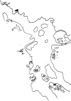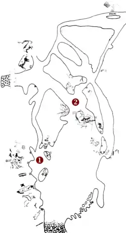- Третья большая группа располагается на сталактитовом гребне, свисающем со свода (называющимся в спелеологии флагом), между двумя вышеописанными группами. Обе группы находятся близко, но отличаются по примененным техникам,[13] что наводит на мысль о том, что они были исполнены в отдаленные эпохи. Присутствуют около десятка олених, немалое количество лошадей, два полорогих и квадратный знак. Если идти от входа, сначала встречаются большинство олених, за которыми следует сочетание лошадиных-полорогих, под которым располагается знак и прочие оленихи.