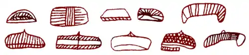 - Грибообразные: так называемых грибообразных знаков сравнительно много, особенно в Галерее B и в Зале XI, тогда как они практически отсутствуют в Галерее A. В Зале XI начертаны наиболее типичные знаки этого типа, сопровождающие, как правило, лошадей. Одно из изображений Леруа-Гуран описывает как «пристыкованный знак»,[18] так как он объединяет в одном абстрактном рисунке линии или палочки (мужское начало) с грибообразным знаком (женское начало). Типология и хронология этих знаков отличается разнообразием.