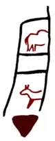 - Четвертая и последняя большая группа располагается напротив предыдущей и тесно связана с ней, так как содержит приблизительно одинаковое количество оленей и лошадей и пару зубров. Из знаков выделяется абстрактный рисунок в форме руки, похожий на найденные в пещере Сантьян,[14] и красный знак, который напоминает гротескную голову зубра. В центре композиции фигурирует типичная двойственность лошади и зубра; в одном конце находится другой зубр, а в противоположном — остальные лошади. Нет плашечных цветов, гравировки, ни дихроизма; напротив, доминирует вязкий, более-менее моделирующий рисунок красного цвета.