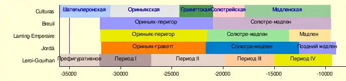 Описанные находки относятся, главным образом, к позднему этапу солютрейской культуры и раннему этапу мадленской, несмотря на что, встречаются и более древние предметы. По всей пещере рассеяны остатки наскального искусства — краски и высеченные гравюры. Выделяются изображения лошадиных, оленевых (самок и самцов) и полорогих пород. Также встречаются многочисленные абстрактные изображения.