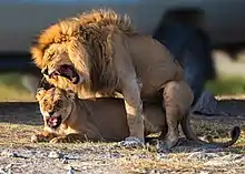 Большинство львиц способно к размножению с четырёх лет[82]. Самцы начинают спаривание с момента наступления проэструса у самок[83]. Как и у других кошек, на пенисе льва расположены шипы, которые направлены в обратную сторону по направлению его движения. При выводе пениса эти шипы задевают стенки влагалища самки, что вызывает овуляцию[84]. Львица может спариваться сразу с несколькими самцами, если у неё наступает овуляция[85]. Во время периода случки, который может длиться до нескольких дней, пара совокупляется от 20 до 40 раз в день и, как правило, отказывается от еды. Львы очень хорошо размножаются в неволе.