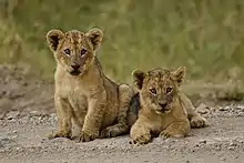 Средняя продолжительность беременности составляет 110 дней[83], после чего самка рожает от одного до четырёх детёнышей в уединённом месте (обычно роды происходят в зарослях тростника, пещере или другом защищённом месте), вдали от остальных членов прайда. Она часто охотится сама, находясь неподалёку от того места, где спрятано потомство[86]. Львята рождаются слепыми и совершенно беспомощными, их глаза открываются приблизительно через неделю после рождения. Масса тела новорождённых — 1,2—2,1 кг, они начинают ползать через день или два, а ходить после третьей недели жизни[87]. Самка переносит детёнышей на новое место несколько раз в месяц; эта процедура осуществляется во избежание накопления запаха в логове, который способен привлечь хищников[86].