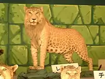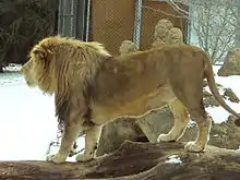 - Panthera leo atrox — американский пещерный лев. Был распространён в Северной Америке от Канады до Перу в эпоху плейстоцена. Вымер 10 000 лет назад. Иногда американского и пещерного львов считают отдельными видами, но последние филогенетические исследования показывают, что обе формы — подвиды льва[16][27]. Был одним из крупнейших подвидов льва — длина тела составляла 1,6 — 2,5 м[28], а вероятная масса тела до 250—300 кг[29]. Его отличительными чертами были: крупная голова с заметными баками, плотное сложение туловища, мощные ноги и длинный хвост (скорее всего — без кисти на конце). Наличие гривы сомнительно[29].