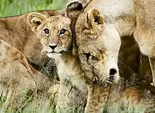 Львы относятся к хищникам, имеющим два типа социальной организации. Чаще всего они проживают в группах, которые называют прайдами[60]. Прайд обычно состоит из пяти или шести родственных между собой самок, их детёнышей обоих полов и одного или двух самцов (в последнем случае прайд называется коалицией), которые спариваются со взрослыми самками. Число взрослых львов в коалиции, как правило, два, но их количество может возрасти и до четырёх, а затем снова уменьшиться. При достижении половой зрелости молодые самцы покидают прайд.